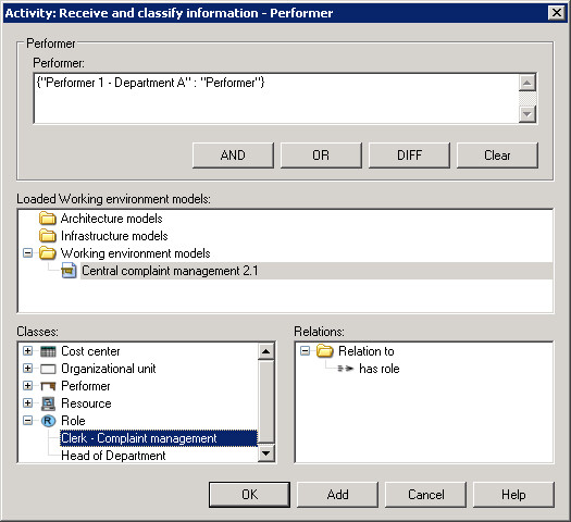 The window "<class name>:<object name> - Performer", in which you can define the activity's performer, is opened.