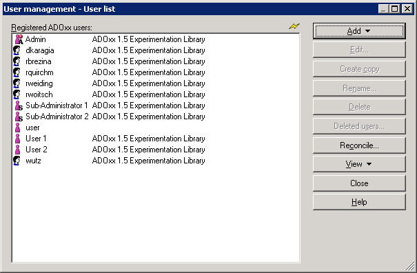The window "User Management - User list" will appear on your screen, showing all ADOxx users sorted by the criteria as defined.