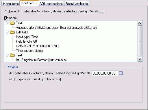 The current elements selected (field "Elements") are displayed in the order of their definition in the field "Preview". This corresponds to the display of the query in the ADOxx Modelling Toolkit. Each change to this list - be it the insertion of a new element or the editing or deletion of an existing element - is immediately shown in the field "Preview".