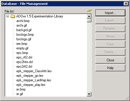 Rename a file from the ADOxx database, by selecting the file to be changed in the window "<Data base name> - file management" and then clicking on the button "Rename".